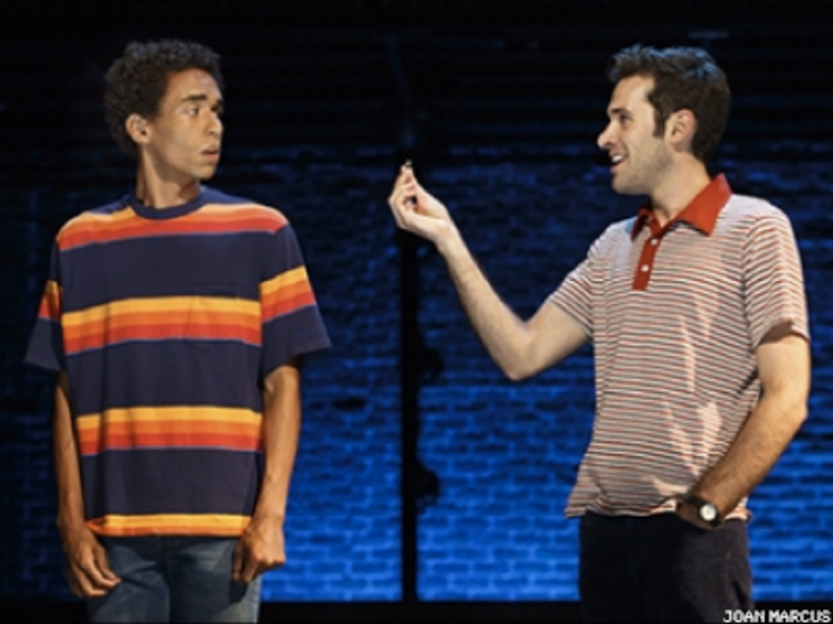 An old wedding ring strengthens the bond between superhero-obsessed Brooklyn boys, black Gus and Jewish Dylan -- dynamic duo Kyle Beltran and out actor Adam Chanler-Berat -- in Itamar Moses and out composer Michael Friedman's soaring, soulful adaptation of Jonathan Lethem's 2003 coming-of-age novel. Dylan recalls Gus as "my best friend, my lover" in the book, but the magical-realist musical, helmed by Daniel Aukin, only hints at sexual experimentation.