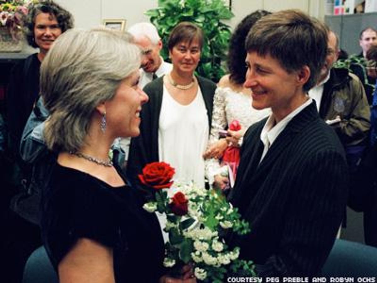 Robyn Ochs and her partner, Peg Preble, tied the knot after the ban on same-sex marriage was overturned in Massachusetts, the first U.S. state with marriage equality. Ochs and Preble were happily together for seven years before racing to the altar in a mad dash to beat any further legal challenges by then-Gov. Mitt Romney or others opposed to marriage equality. They wed May 17, 2004 making national news and history as one of the first same-sex couples to marry.