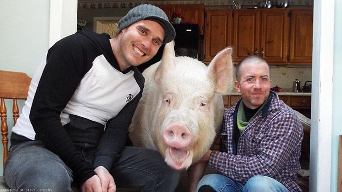 Now, as of early March, there's an Esther-themed children's book -- The True Adventures of Esther the Wonder Pig, which tells of how, in 2012, Jenkins and Walter thought they'd adopted a micro-pig that would possibly grow to be 70 pounds but soon outgrew her cat bed as a piglet, then her dog bed, and then her children's mattress. The book from Jenkins, Walter, and Caprice Crane, with illustrations from Cori Doerrfeld, relates how Esther's dads' expectations of her changed as she did. As she grew, so did their love for her.