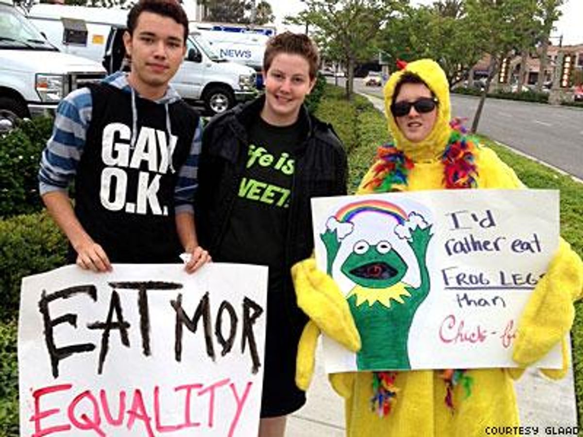 Now protests are popping up at Chick-fil-A's that have already set up shop. In Laguna Hills, Calif., young people from an Orange County LGBT center protested outside a new Chick-fil-A this morning. And in Washington, D.C., where a new Chick-fil-A food truck recently debuted, the Human Rights Campaign was on hand with signs to ensure customers know where their money is going.