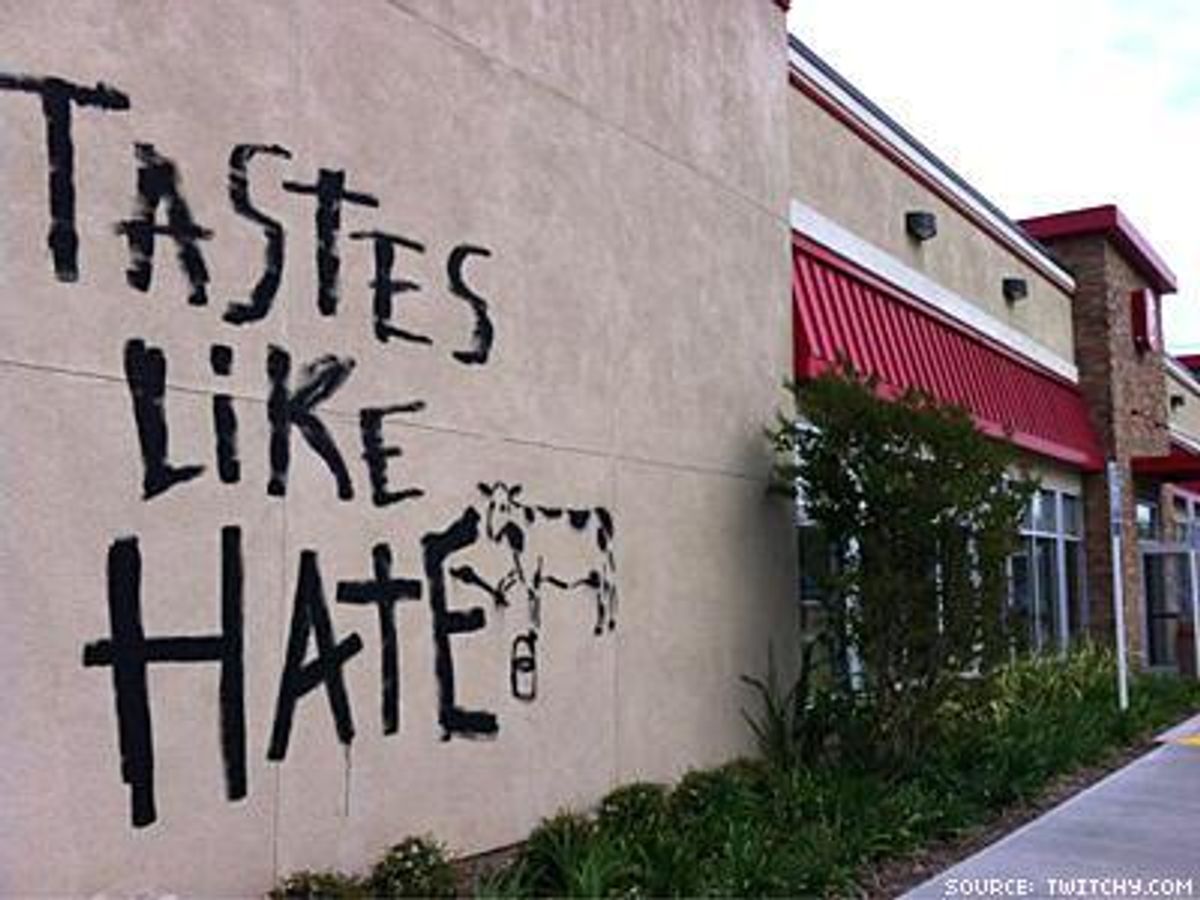 The graffiti was accompanied by a painting of a cow holding a paintbrush, similar to the mascot the company uses in its ads urging patrons to "Eat Mor Chikin."