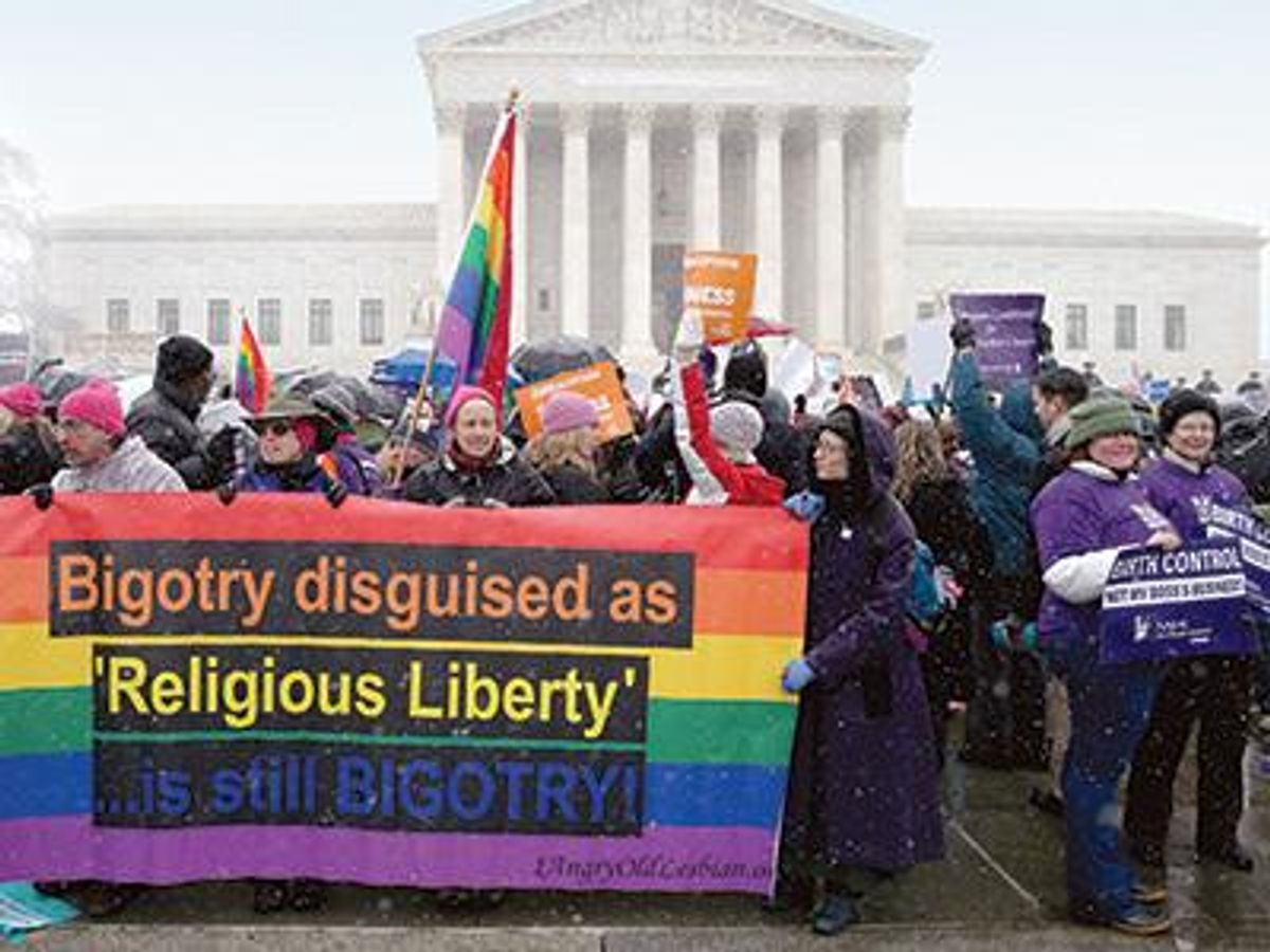 Demonstrators rally outside of the U.S. Supreme Court during oral arguments in Burwell v. Hobby Lobby Stores, Inc., March 25, 2014 in Washington, D.C. The only real application of the RFRA apparent to critics was the potential for it to be used against LGBTs. Since there is no federal or statewide law protecting LGBTs from discrimination in Indiana, the proverbial Christian pizzeria denying services to a gay couple wasn't proverbial for long. If the impetus to use religion as the means to beat up on gays came from the expansion of marriage equality, then the justification came from the Hobby Lobby decision.