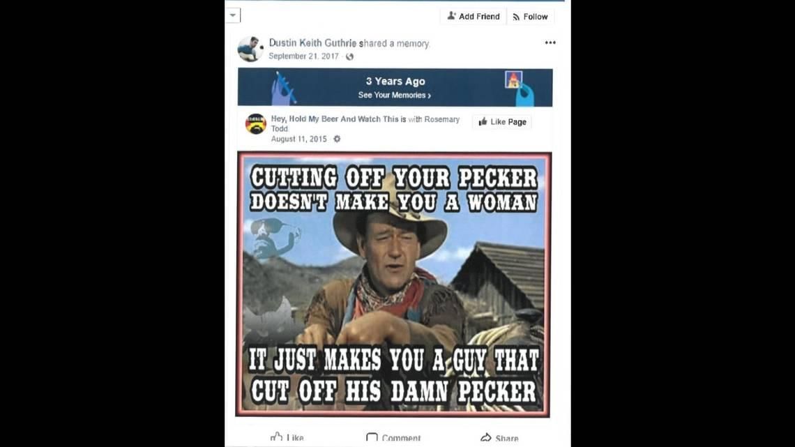Another, from September 2017 (around the time Wade came out to her coworkers), included a meme of John Wayne that reads: "CUTTING OFF YOUR PECKER DOES NOT MAKE YOU A WOMAN. IT JUST MAKES YOU A GUY THAT CUT OFF HIS DAMN PECKER."