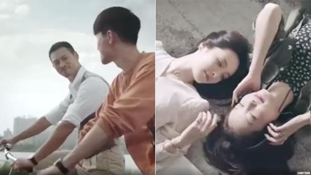 The insinuation from the text, visuals, and sweeping music is that the pairs presented in the ad are all lovers. However, shoppers at Tmall -- China's premiere digital shopping marketplace -- are reporting on social media that the same-sex couples in the video are also featured as still-image ads with captions claiming their relationships are strictly platonic.
