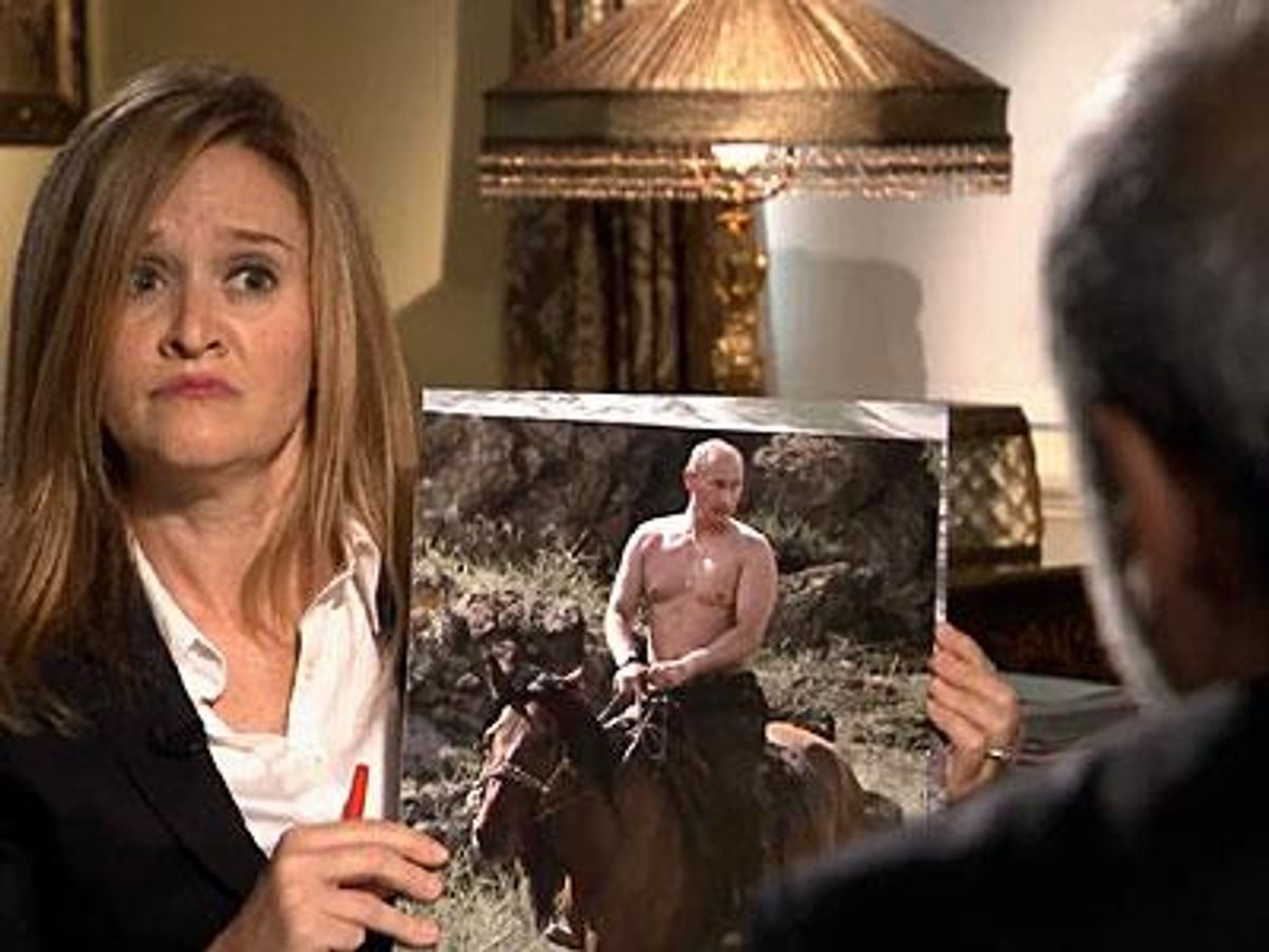 "Come on...the guy looks like a gay centaur," Bee says, holding a picture of a shirtless President Vladmir Putin riding horseback through the Russian wilderness. "This guy right here is one glitter cannon away from leading our Gay Pride parade."
