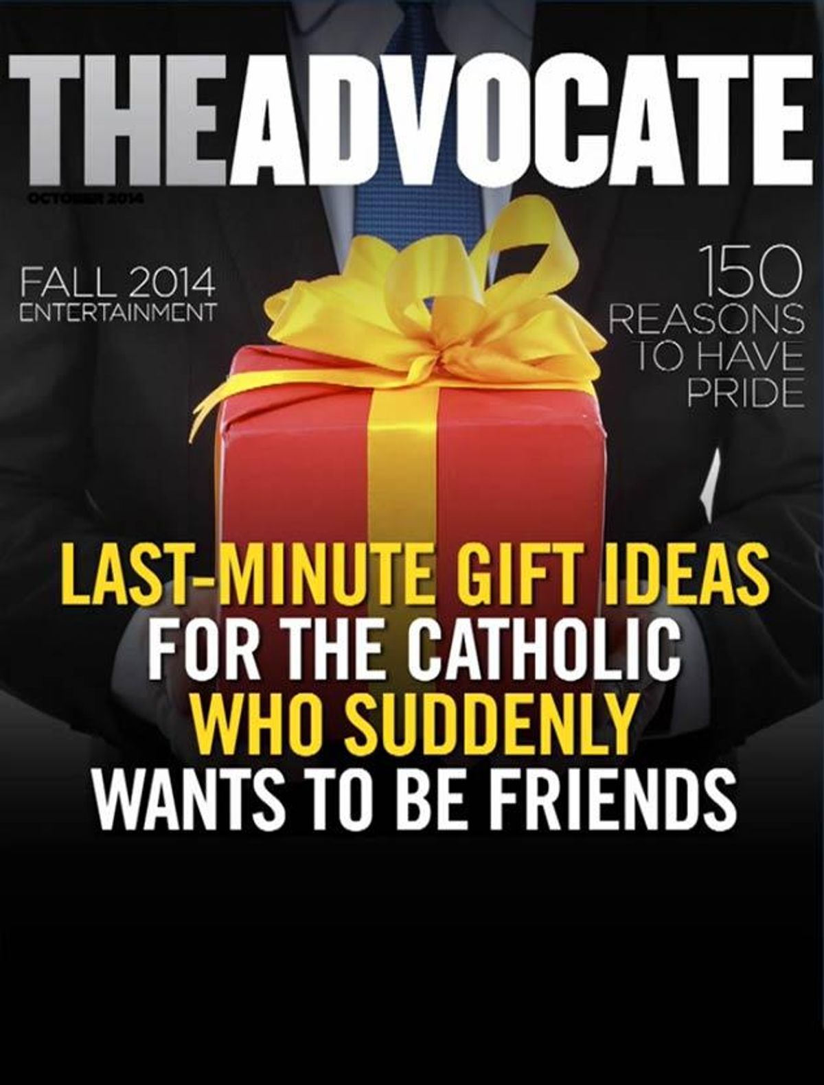 The talk show broadcast a mock cover of the LGBT publication, which listed the cover story as "Last-Minute Gift Ideas for the Catholic Who Suddenly Wants to Be Friends."