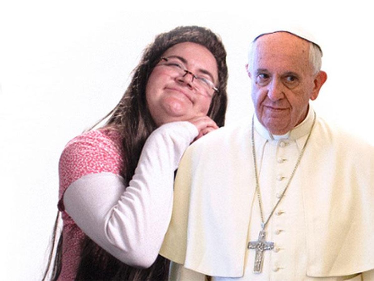 Well, that's the premise of a new Funny or Die video, which depicts the non-Catholic Davis beating out people who help the poor, visit prisoners, or devote their lives to the Catholic Church for the privilege of a clandestine meeting with, as the parody version of Davis calls him, this "guy in a funny hat."