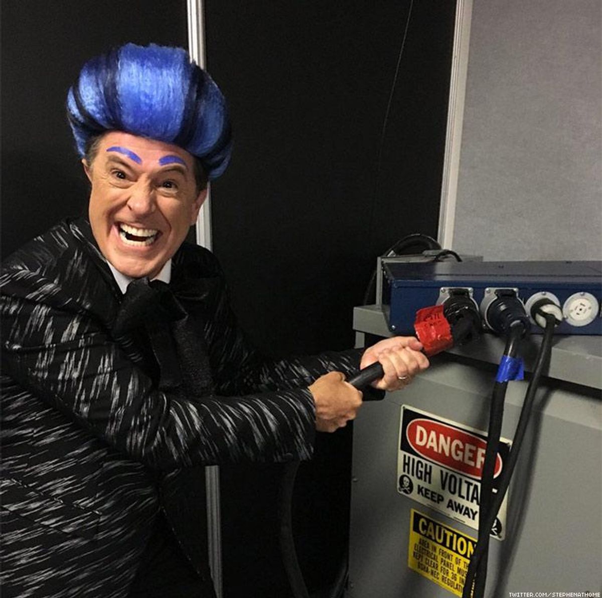 Taking the stage unannounced, holding a stuffed weasel, and wearing a bright blue wig in a tribute to Hunger Games emcee Caesar Flickerman, Colbert remarked, "I know I am not supposed to be up here, but let's be honest, neither is Donald Trump."