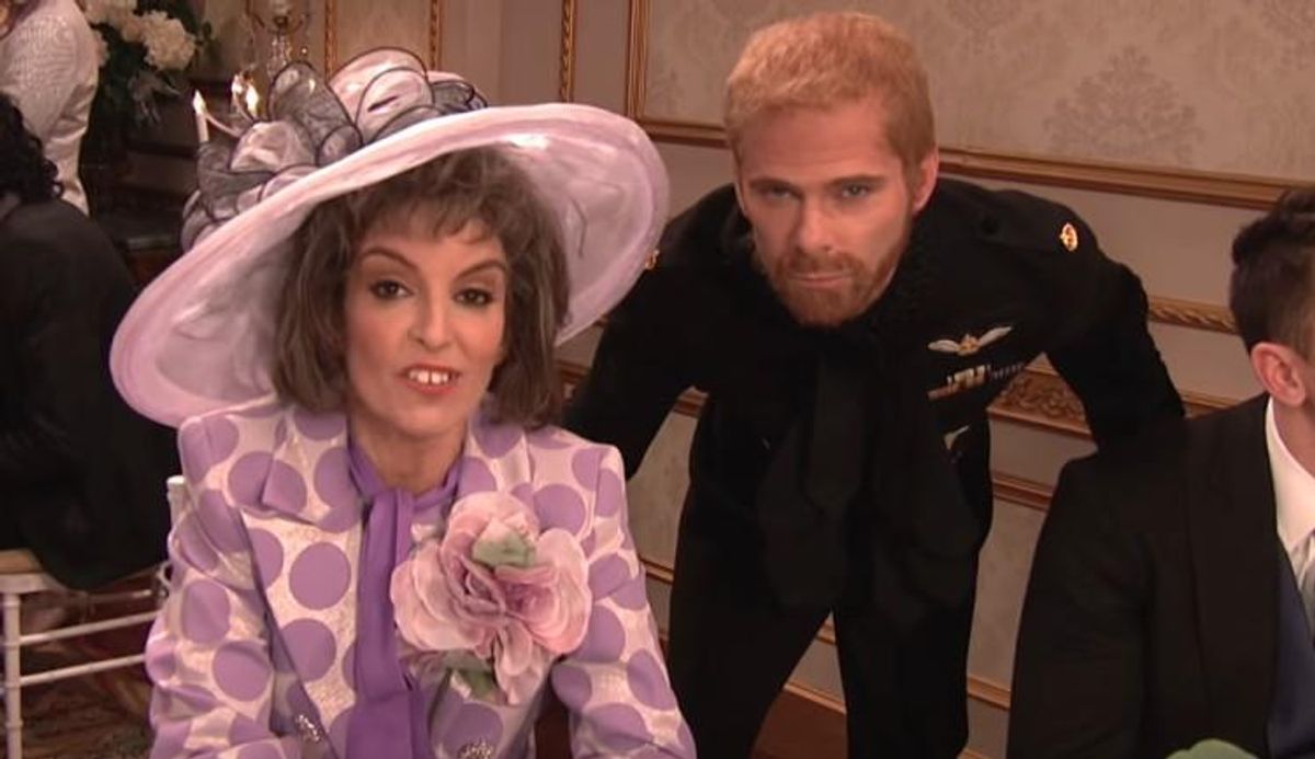 "I am both your aunt and your niece," Tina Fey, portraying a fictitious Royal Wedding guest, explained to Prince Harry (Mikey Day), as he gave Saturday Night Live viewers a tour of the B-list reception.