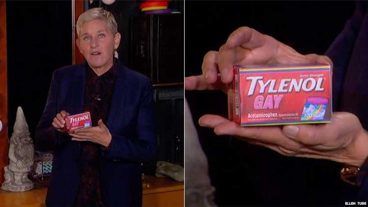 To counter this epidemic, Ellen DeGeneres pitched a new (fake) medication: Tylenol Gay.