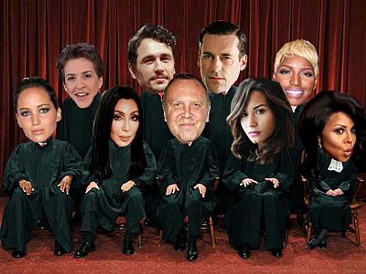 It's bad enough that so many huge aspects of our lives are left to the whims of others, with bumbling bosses, careless babysitters, and vengeful in-laws. But at least we know these people and can play to their vanities. Considering the justices' disastrous votes on everything from corporate spending to voting rights, it's time we consider replacing them with people we all know: celebrities. They put their lives out there (so we get attached and see their movies or TV shows, but so what) and we get to decide whether we like or loathe them. That personal transparency seems fair: If they're going to judge us, we should be able to judge them.