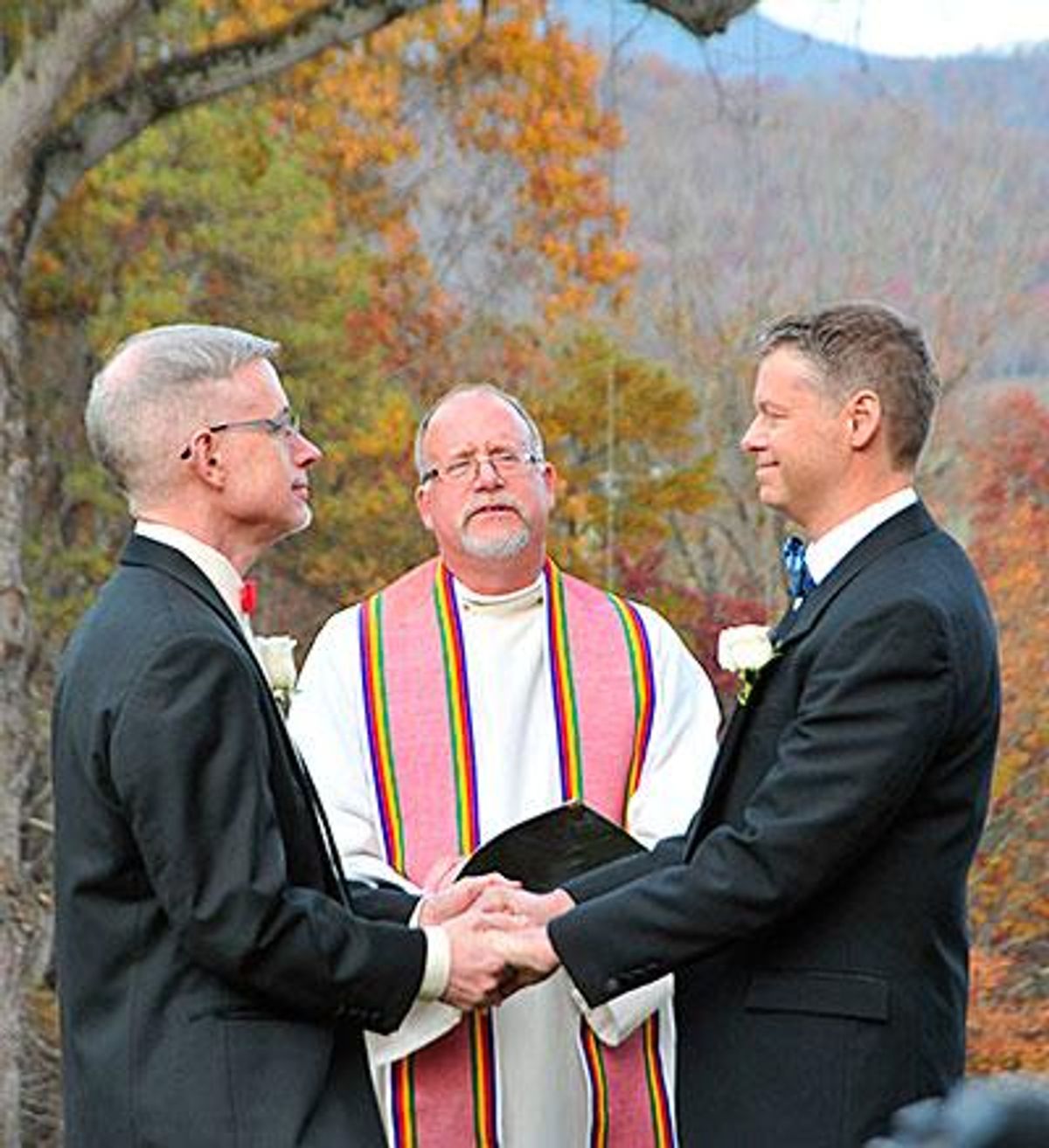 But in our 28 years together, Christopher and I have been legally and permanently married only once, and that was November 8 on the meadow behind our home in the Blue Ridge Mountains of North Carolina, just outside of Asheville. We threw the whole thing together in about two weeks' time and still had about 75 people come and celebrate with us, ages 1 to nearly 90, most of them straight. Christopher's students from the New Media program at the University of North Carolina in Asheville came en masse and were among the most excited guests of all.