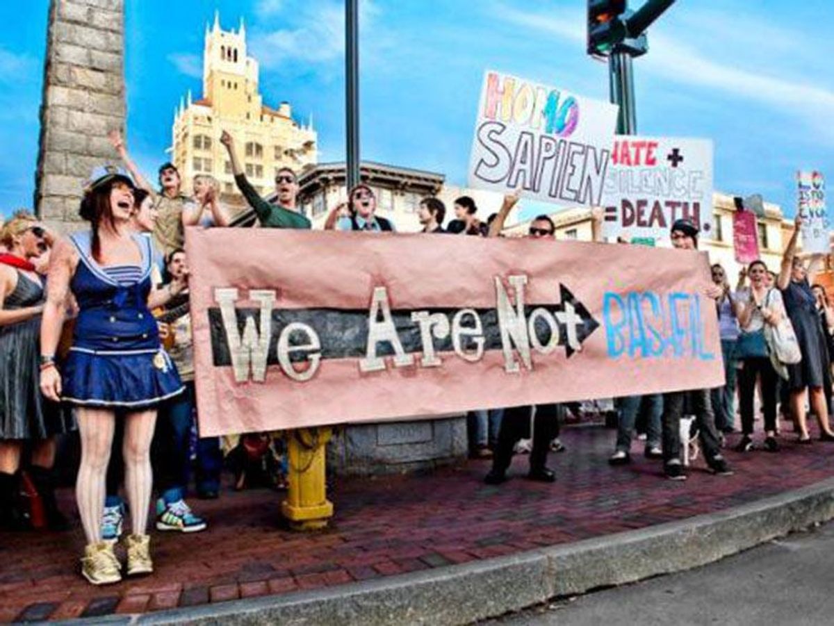 I had a similar reaction in 2013 when a prominent marriage equality organization in Asheville effectively asked JUFA to cancel an annual event because this larger, better-funded group had a demonstration planned for the same day. The cis lesbian leaders of that organization called me just days before JUFA's annual rally (pictured above) called "We're Not Bashful."