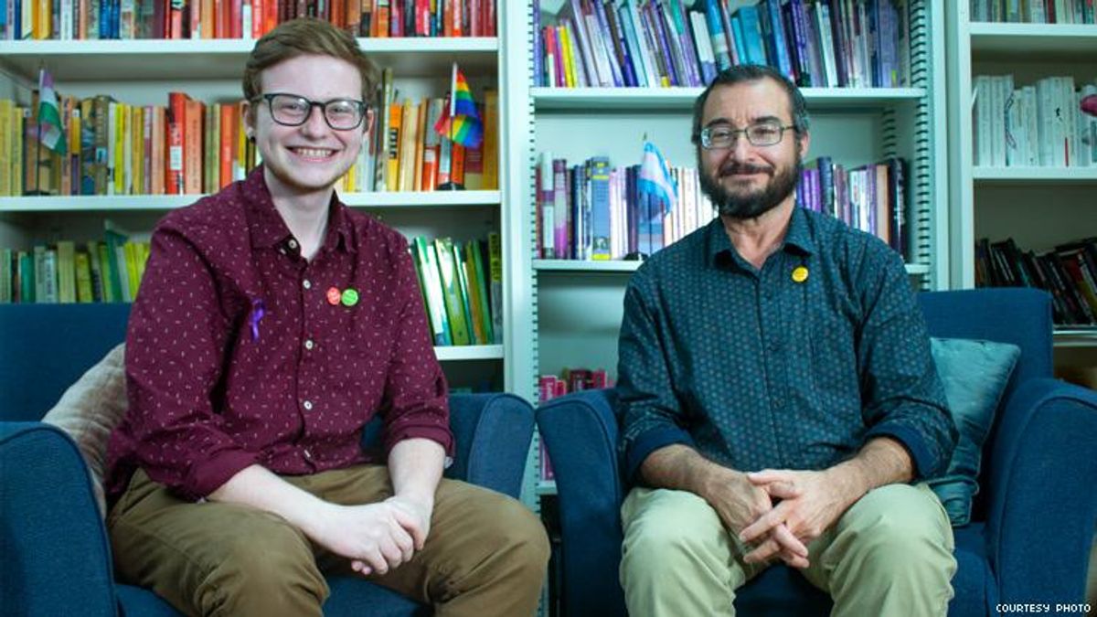 I enthusiastically volunteered to be a part of the group as the LGBT Center at Ithaca College, where I have the privilege of serving as the director, has been working to increase awareness of the needs of transgender and non-binary students, staff and faculty for decades. Once we convened as a team and an executive board was established, we have worked diligently on logistics, resources, and outreach. Our Ithaca College LGBT Center student employee, Cal Goodin (pictured above, left, with me), also played a role, deploying skills he developed while interning at The Advocate last semester to collaborate with the team to create Facebook profile frames to recognize the day.