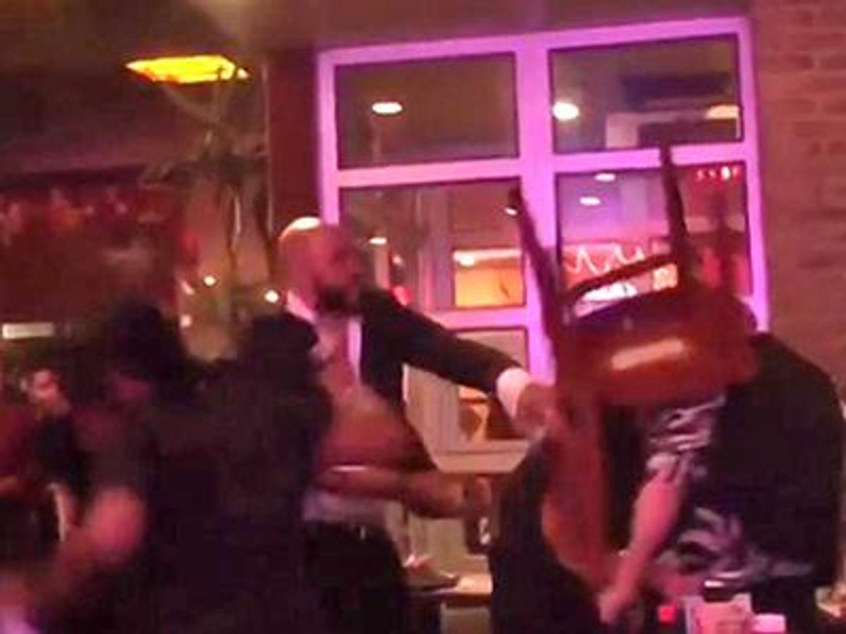 A longer YouTube video of the melee shows a crowd of people shouting and attempting to restrain the attacker, who exits the Eighth Avenue restaurant after throwing the piece of furniture.