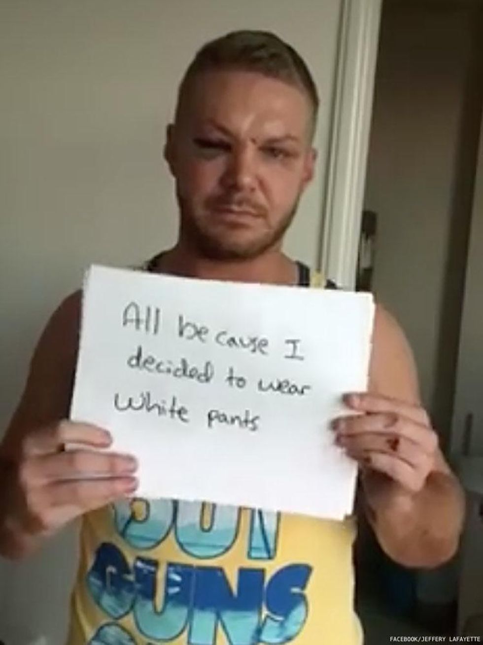"I was gay bashed in San Francisco," Lafayette wrote. "They spat on me and kicked me as I screamed for help ... all because I decided to wear white pants. And I don't think it had anything to do with Labor Day."