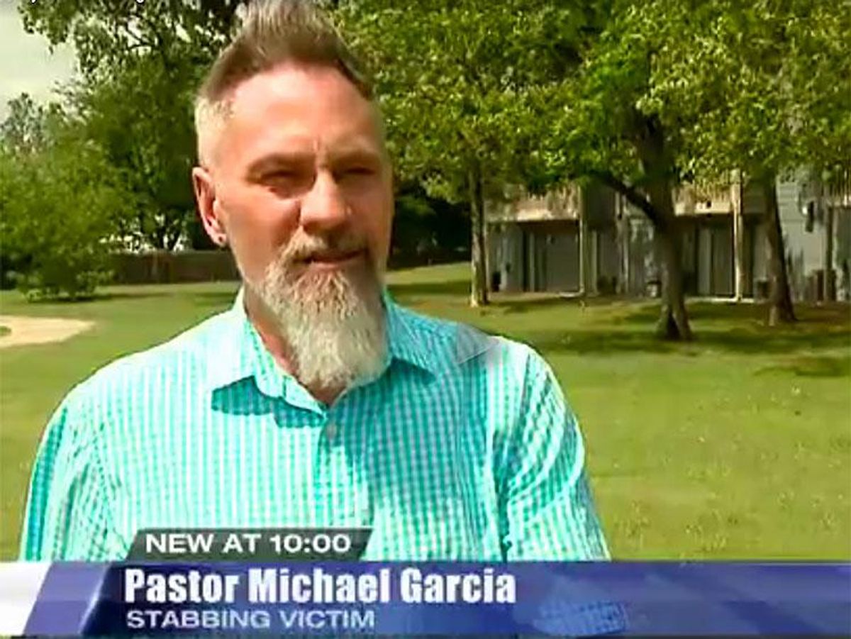 "[He] moved toward me and shoved a blade in my stomach and referred to me as a 'stupid f****t pastor,'" Garcia told Wichita TV station, KAKE. The stab wound went through Garcia's muscle leaving him with a visible scar on his stomach and as Garcia lay on the ground, the man ran off.
