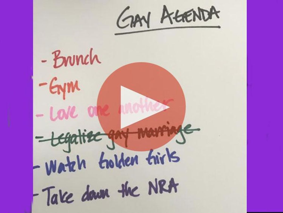 A tweet gone viral, titled the "Gay Agenda," shows a rainbow-colored to-do list: "Legalize gay marriage," "Watch Golden Girls" and "Take down the NRA."