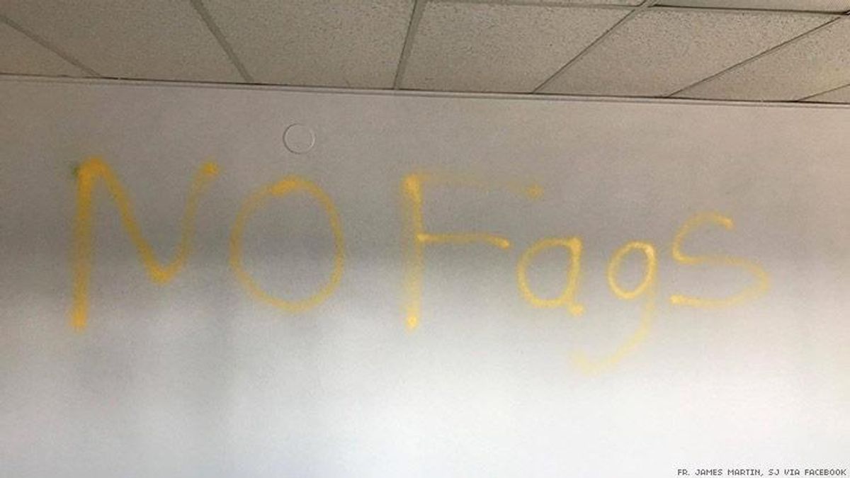 Aaron Bianco, a pastoral associate at St. John the Evangelist Catholic Church in the city's University Heights neighborhood, found "no fags" spray-painted on an office wall when he arrived at the church Monday, local TV station KNSD reports.