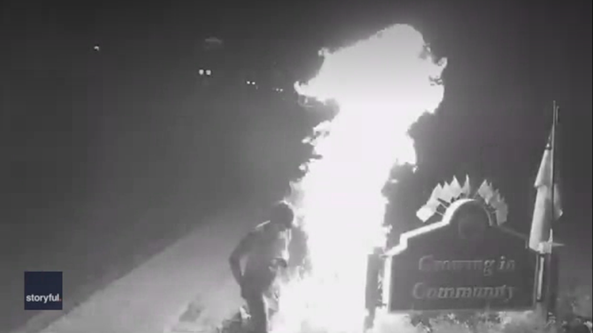 In video of the incident, the man pulls out a container, douses the display with what's in the container, and sets it alight with a lighter. The fire consumes the flag and almost catches the man.