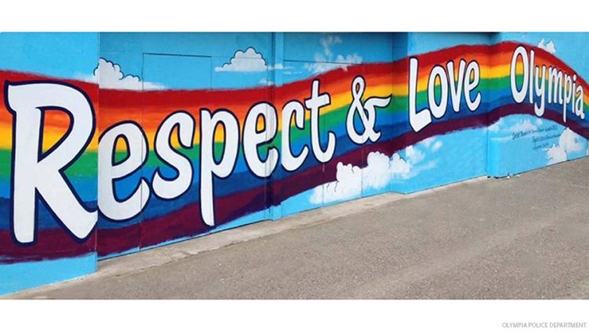 The video shows six men defacing a rainbow-colored mural painted on the side of a city-owned building and emblazoned with "Respect & Love Olympia." After antigay hate crimes took place in 2014, community leaders installed the mural, the paper reports. Two masked men patrolled the area while the Patriot Front vandals spray-painted the mural white.
