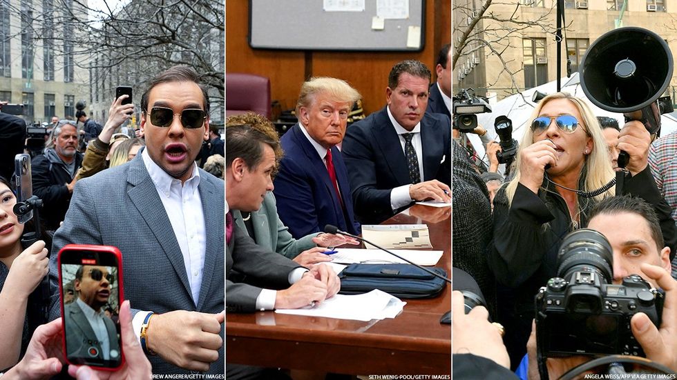 The gay fabulist and New York Rep. George Santos made brief appearances outside the Manhattan courthouse ahead of former President Trump's arraignment Tuesday morning. Also before Trump's arrival, Rep. Marjorie Taylor Greene, the outspoken transphobe from Georgia, made a brief appearance outside the courthouse.