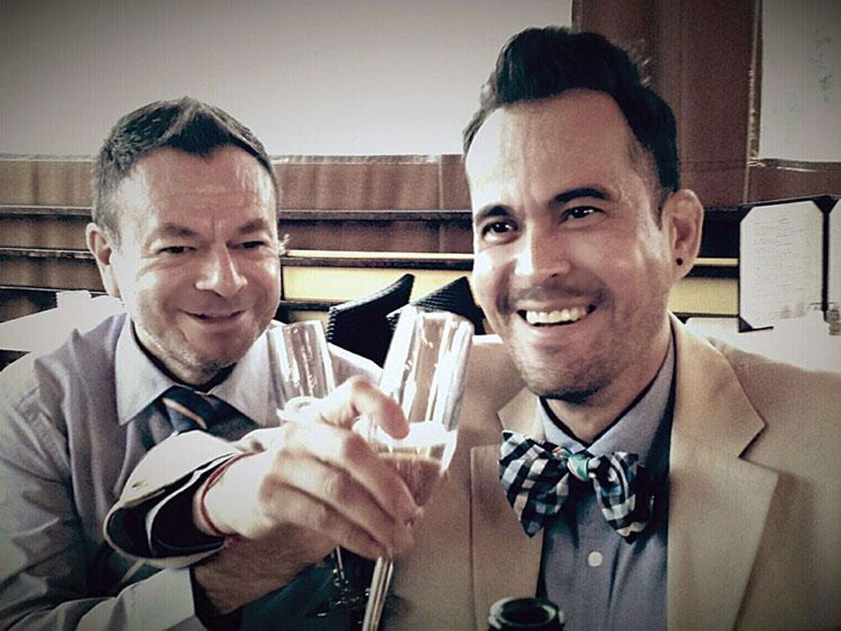 Eleven months later, on December 6, 2013, six months after the United States Supreme Court affirmed a federal district court ruling in California allowing same-sex couples to obtain marriage licenses, the couple invited eight of their closest family members and friends to an informal, but thoughtful, wedding at City Hall in Beverly Hills. Melendez gifted guests with $0.99 Ikea teddy bears that he spruced up with neckties engraved with the pair's names and the date of their union. The gathering, which was topped off with a Brazilian feast at Bossa Nova, a restaurant they've been dining at since arriving in the States, wasn't without sadness.