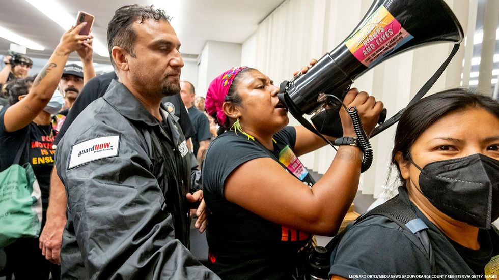 Pictured: A security guard and a protester at the Orange Unified meeting