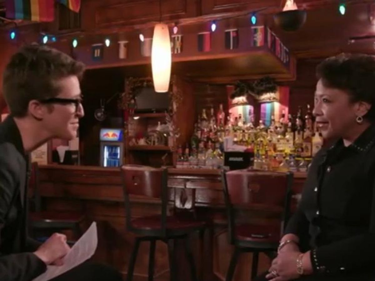 "History is on the side of marginalized people," Attorney General Loretta Lynch told out journalist Rachel Maddow on her MSNBC show Tuesday night. In an interview conducted at New York's Stonewall Inn -- the birthplace of the modern LGBT rights movement -- Maddow asked Lynch about equality in the age of Donald Trump and his potential AG, homophobic and possibly racist Alabama Sen. Jeff Sessions.