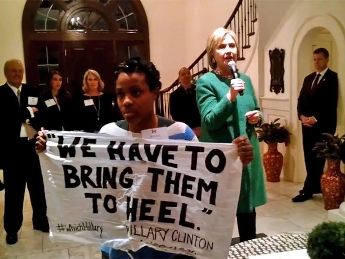 Williams told the Post that an anonymous donor paid for her and fellow activists to attend the private, unlisted fundraiser, which had a $500-per-person price tag. In the video, Williams emerges from the audience, unfurling her protest sign, standing silently for several seconds before Clinton acknowledges her.