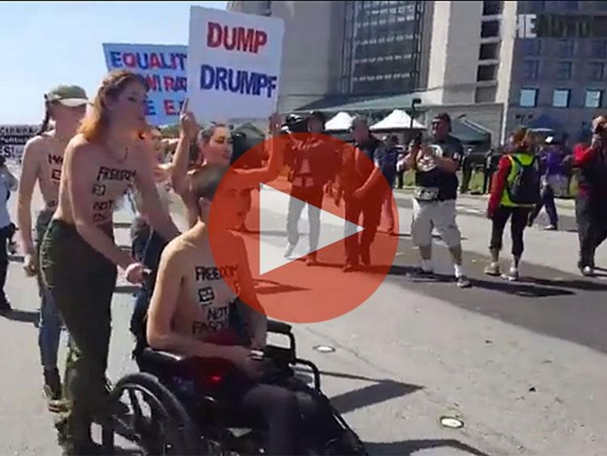 Police in riot gear faced down anti-Trump demonstrators tossing eggs, locked arm in arm and some even topless. The protest forced a detour for the Republican frontrunner.