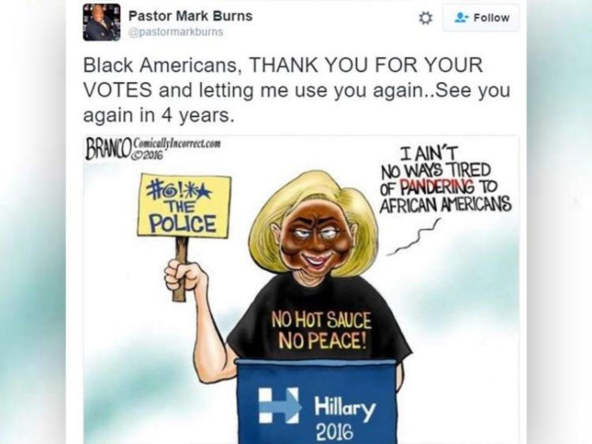 Pastor Mark Burns Monday shared a since-deleted tweet that featured an illustrated version of the Democratic presidential nominee in blackface, carrying a sign that proclaims "[expletive] the police," wearing a black T-shirt that reads "No hot sauce, no peace!" and saying "I ain't no ways tired of pandering to African Americans."