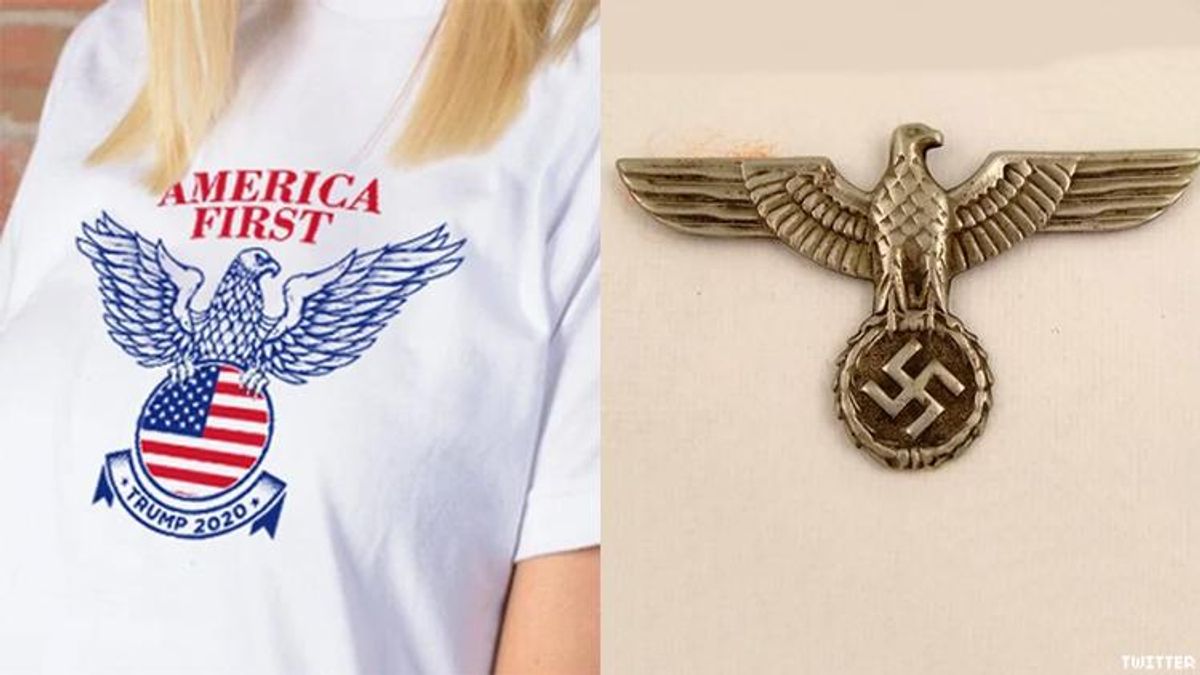 A progressive Jewish group, along with many individuals on social media, are bringing attention to the $30 campaign merchandise. The group, Bend the Arc: Jewish Action, claims the eagle image is not only a call-out to Donald Trump's racist, homophobic, and anti-Semitic followers but that the T-shirt's terminology also has hateful roots.