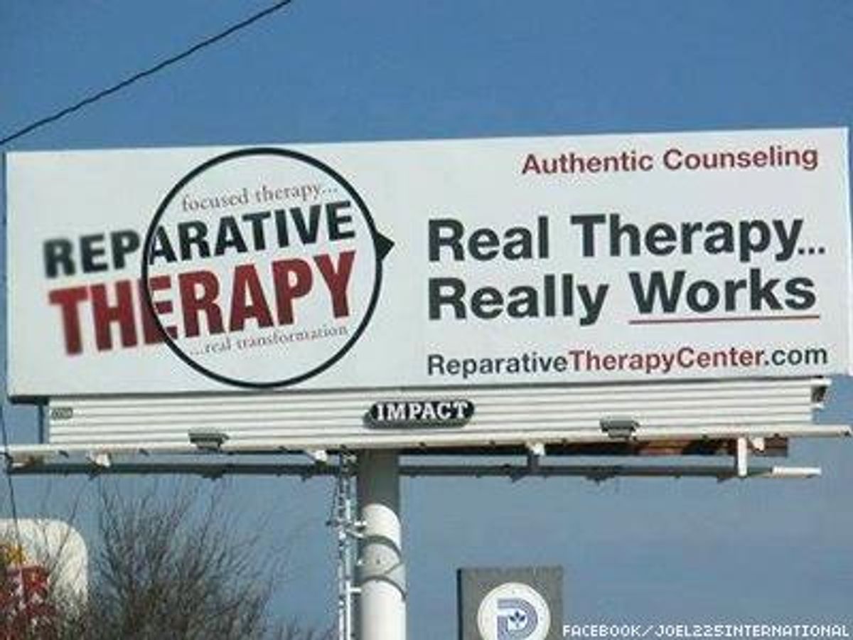 The text on the billboard reads "focused therapy... Reparative Therapy ... real transformation." Touting "Authentic counseling," the largest text on the billboard claims "Real Therapy ... Really Works" and includes the URL ReparativeTherapyCenter.com, which automatically redirects to prominent "ex-gay" therapist David Pickup's website, DavidPickupLMFT.com