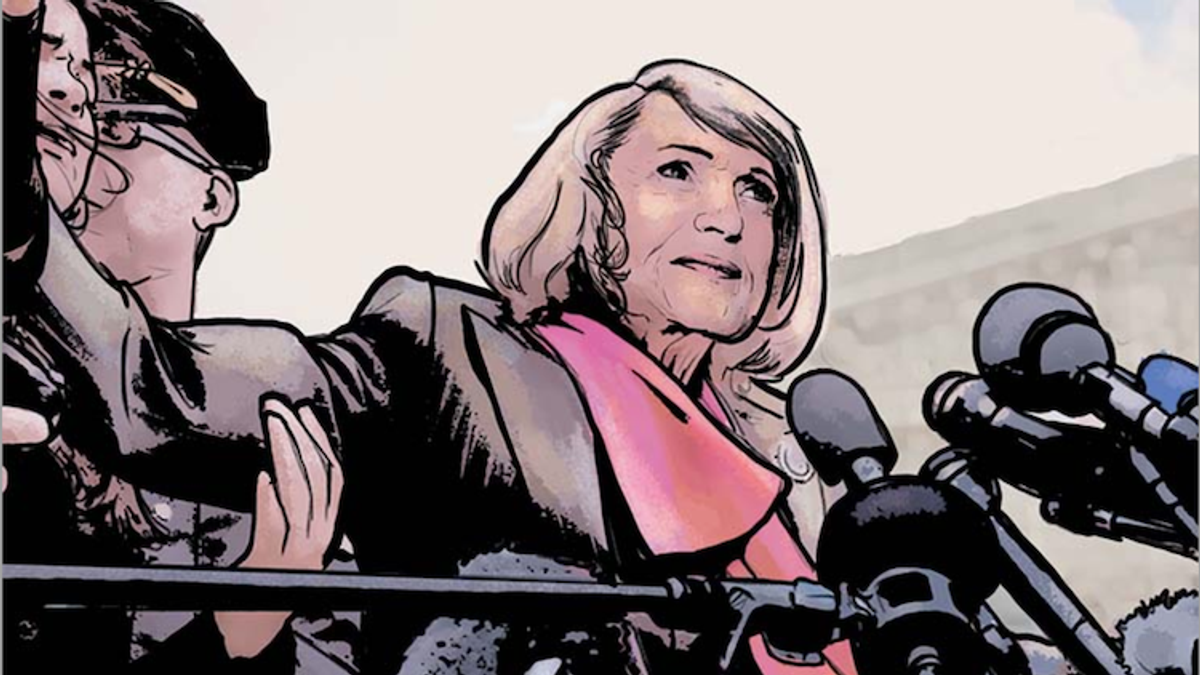 The book highlights the work of 23 true superheroines -- pioneering women around the world, including Malala Yousafzai, Beyonce, Marsha P. Johnson, and marriage equality warrior Edith Windsor. That story follows Windsor from meeting her partner, Thea Spyer, through their marriage and Windsor's ultimate victory in the Supreme Court that paved the way for nationwide marriage equality. Windsor's tale is juxtaposed with another true story, that of writer Amanda Deibert and artist Cat Staggs, the couple who collaborated on telling Windsor's story in Wonderful Women of the World.