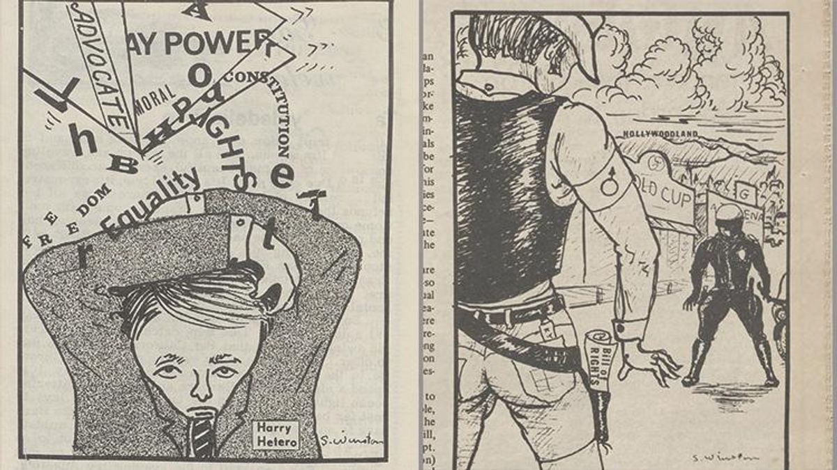 So, John Sam Allen became Sam Allen, Sam, S. Winston, and Sam Winston. Sam's cartoons became a popular feature of The Advocate because they distilled complex issues and reactions to current events into a single frame.