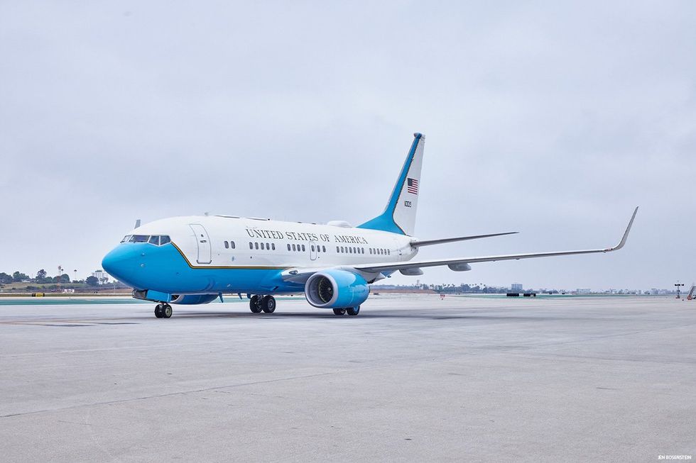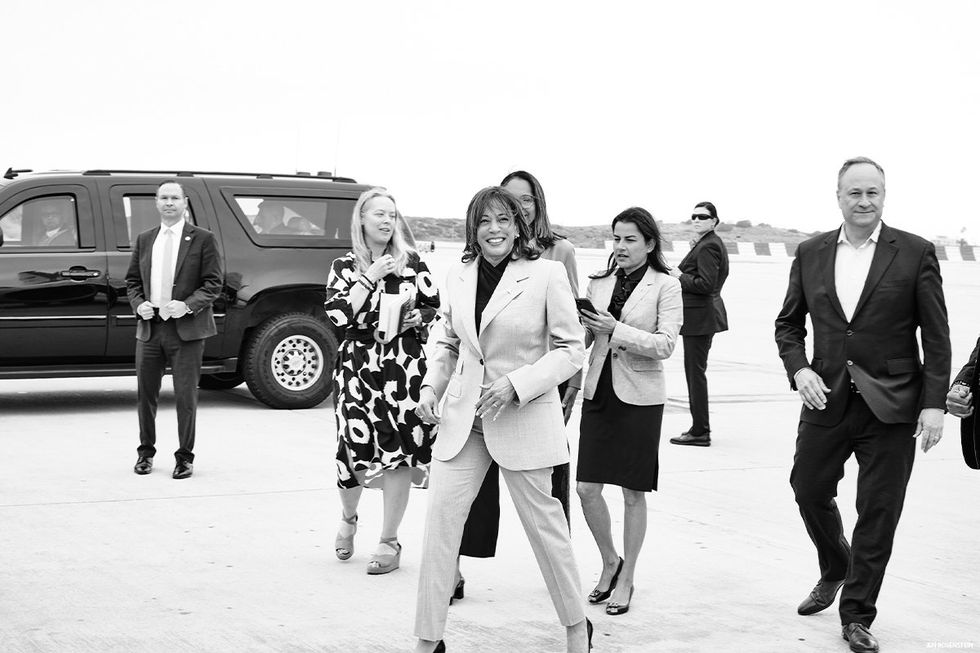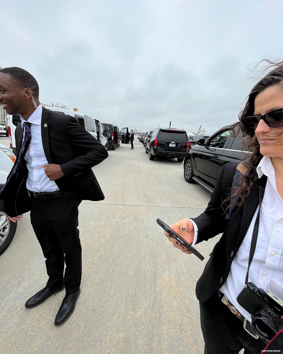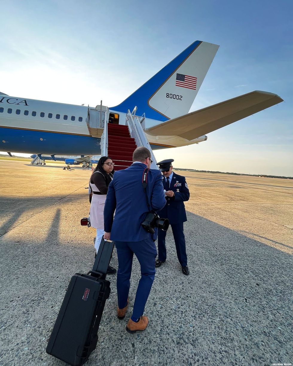 After the staff plane landed at LAX, Tate escorted us to the tarmac where Air Force Two had just landed and brought us “under the wing” (it’s a thing) to observe Harris and Second Gentleman Doug Emhoff emerge from the aircraft, wave, and step into an awaiting SUV.