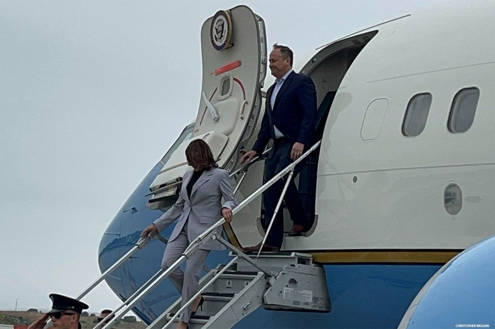 The helicopter landed, Harris and Emhoff emerged and were greeted by an Air Force officer and Reed. The two walked up the stairs, waved at us, and disappeared into the aircraft.