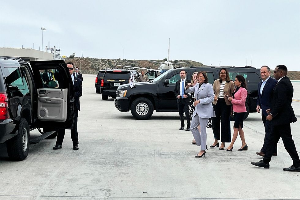 The crew from the press van was ushered out of a side door, where we waited until Secret Service agents indicated that Harris was making her way to her vehicle; thus, the scramble began, and everybody rushed to the awaiting cars and vans before police officers on motorcycles began zooming past to start the motorcade heading to Harris and Emhoff’s Brentwood home. We were again “rolling.”