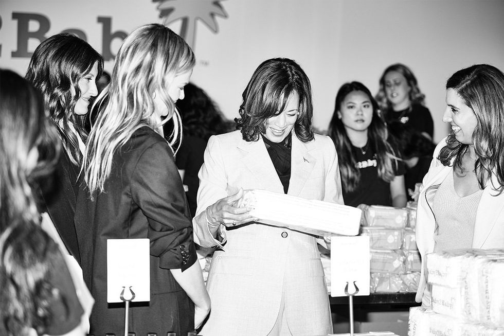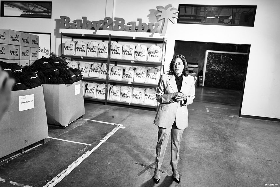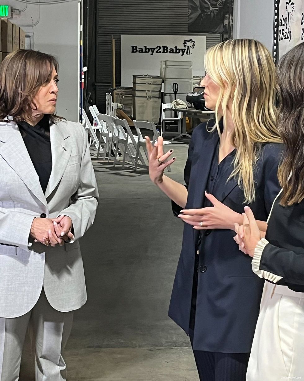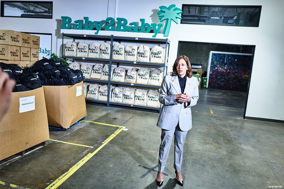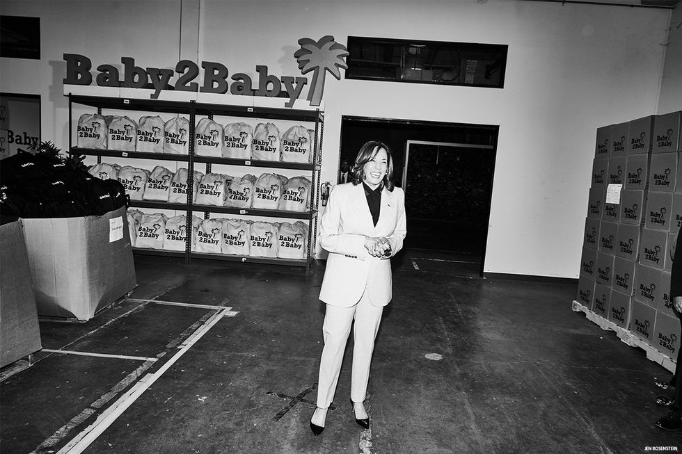 Harris and the Baby2Baby co-CEOs came around a corner and stopped (stepping on their “x” spot markers) as photographers and videographers captured some of the conversations. A few moments later, all journalists were ushered down the hall to the next stop along the tour, and the scene repeated itself. This happened again a few times; each time, the press gathered and waited as the organization’s leaders and the vice president made their way to the next part of the building to be featured.