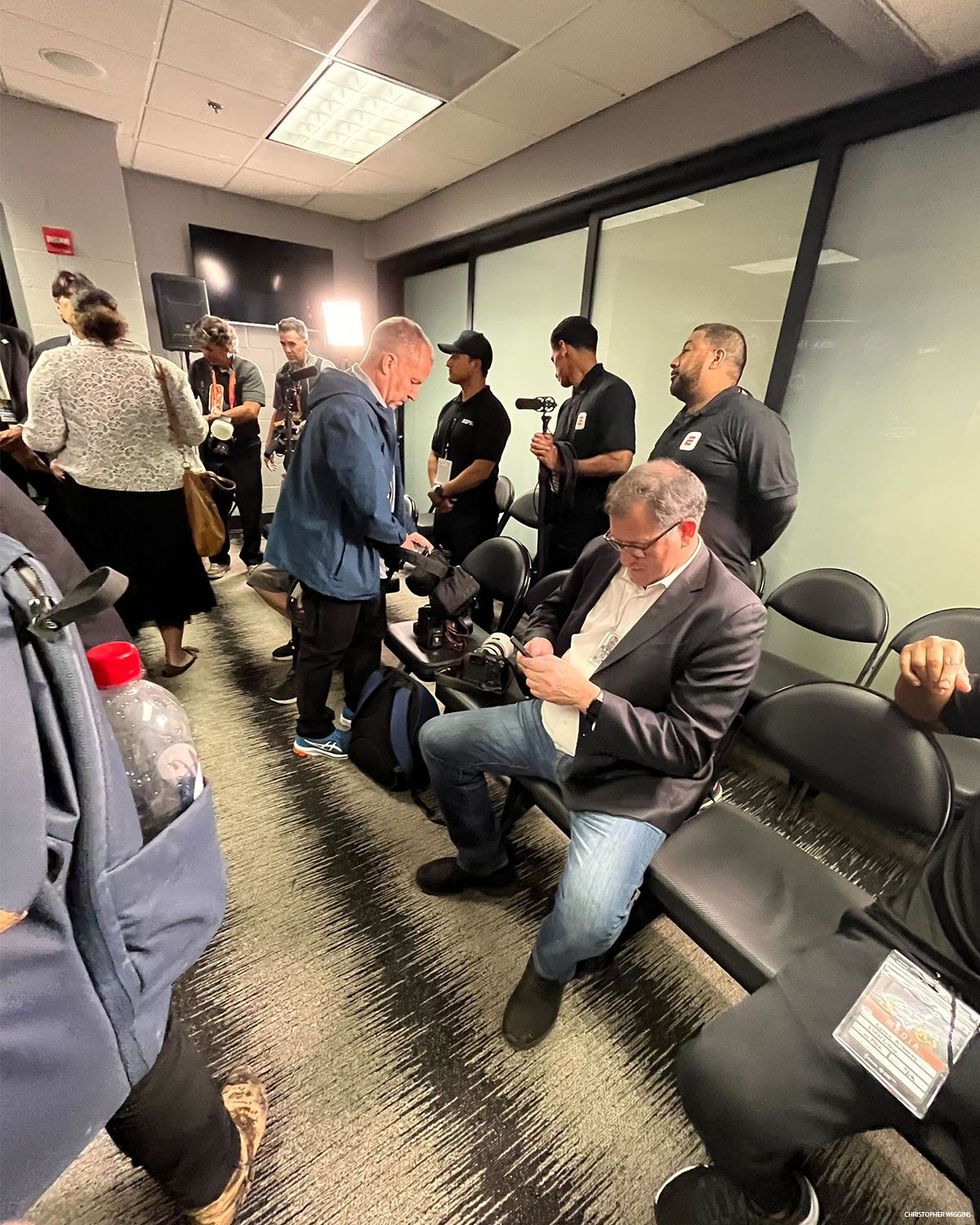 Once there, Harris and the entourage entered the building underground. The press group was taken to a small room used for post-game press conferences and asked to hold.