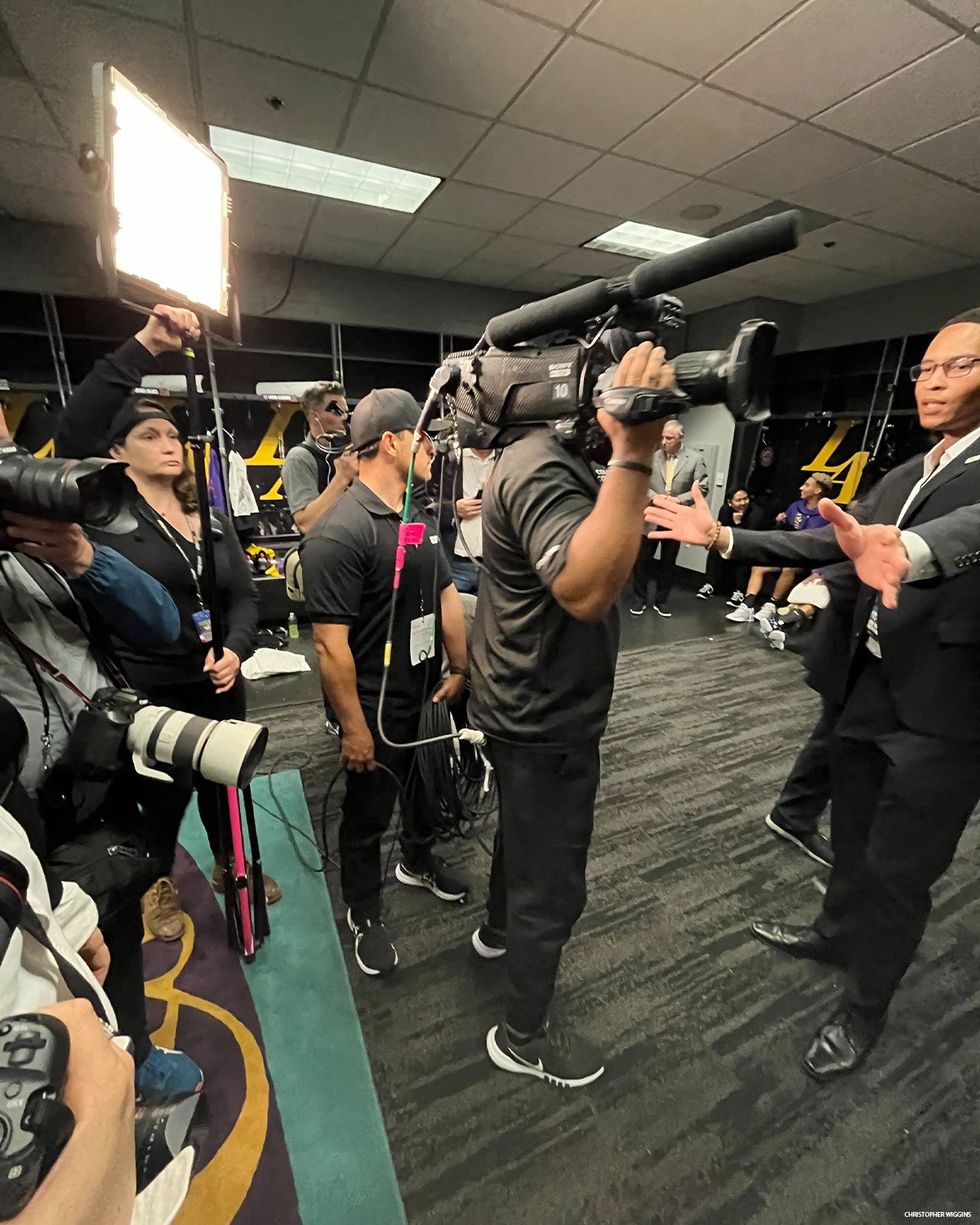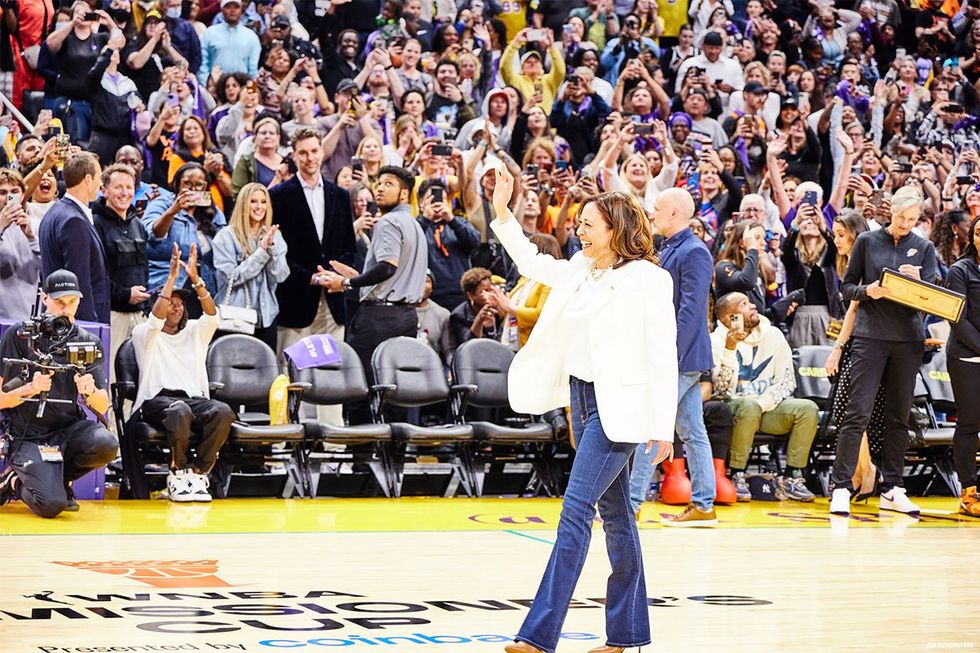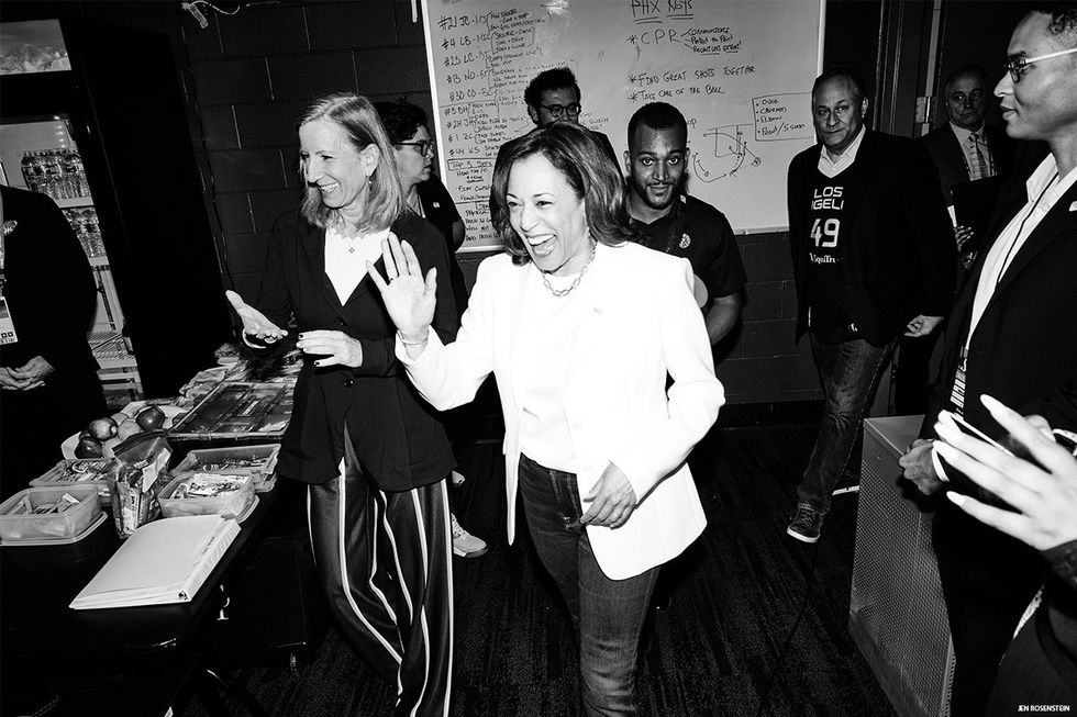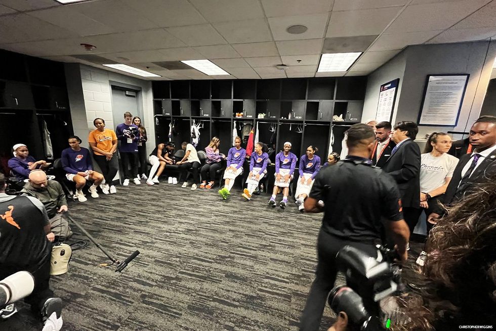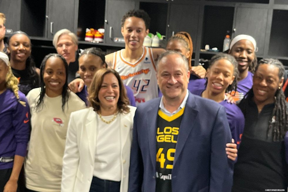 Next, as ESPN producers conveyed the broadcast countdown time until the game would air live, Harris and Emhoff visited the Mercury’s locker room. The press had been ushered in beforehand.