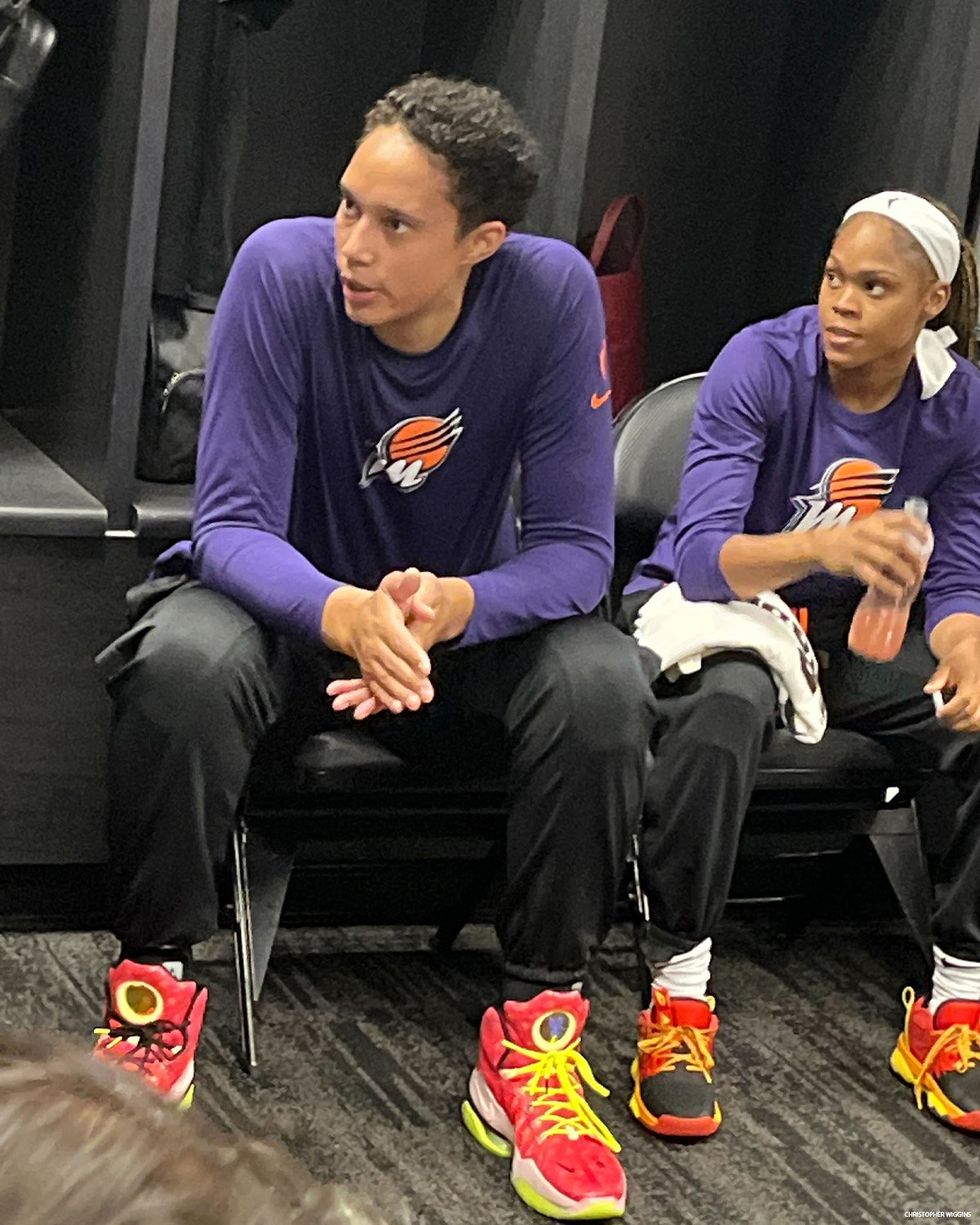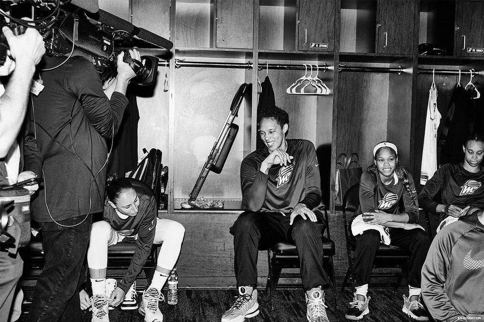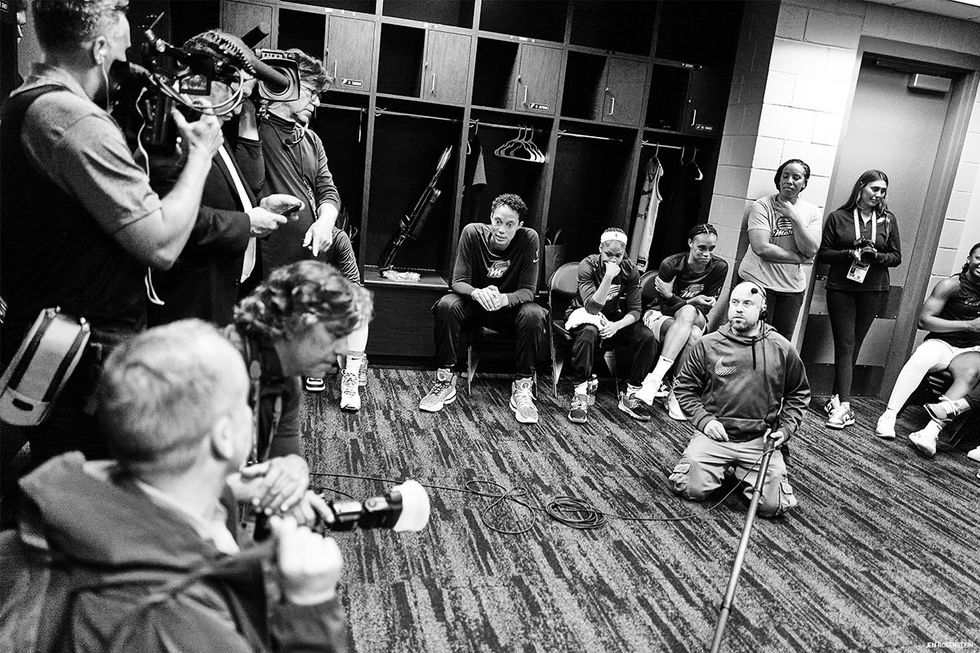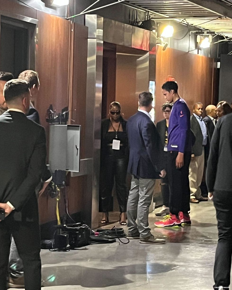 Next, as ESPN producers conveyed the broadcast countdown time until the game would air live, Harris and Emhoff visited the Mercury’s locker room. The press had been ushered in beforehand.