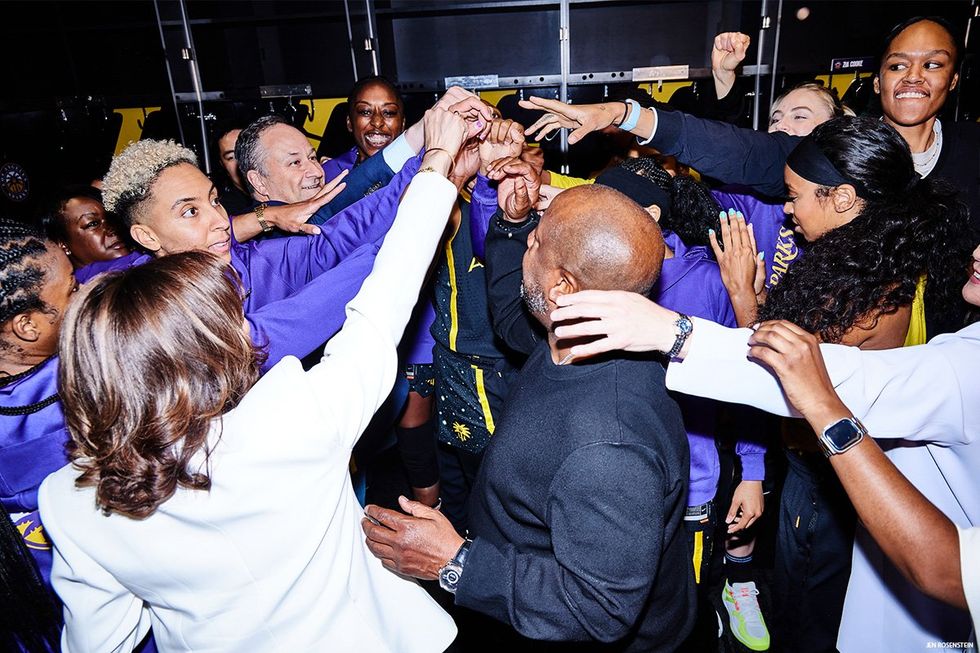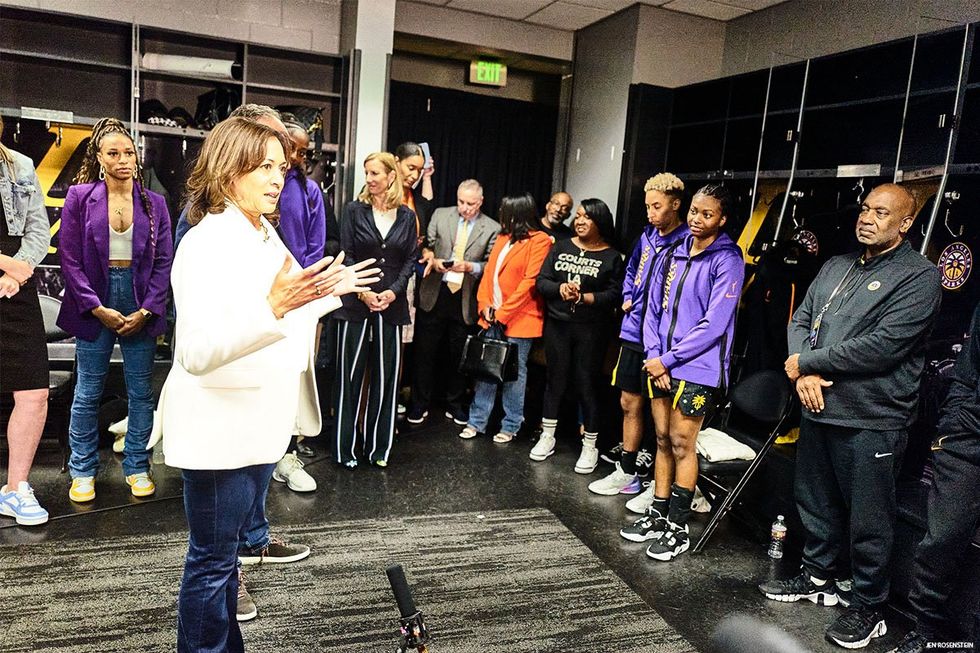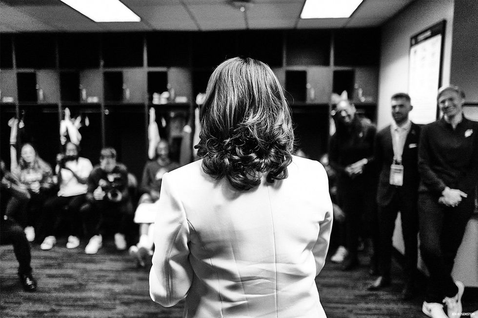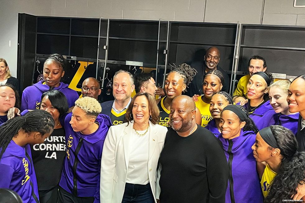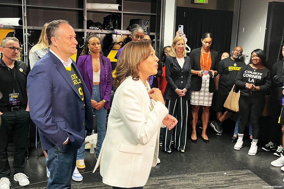 Following a 6-minute visit with the Mercury, the assembled media members were brought to the Sparks locker room, where Harris and Emhoff joined a few minutes later to encourage the home team. As a long-time Sparks fan, Emhoff was very excited, a point Harris made to the team as she invited him to say a few words.