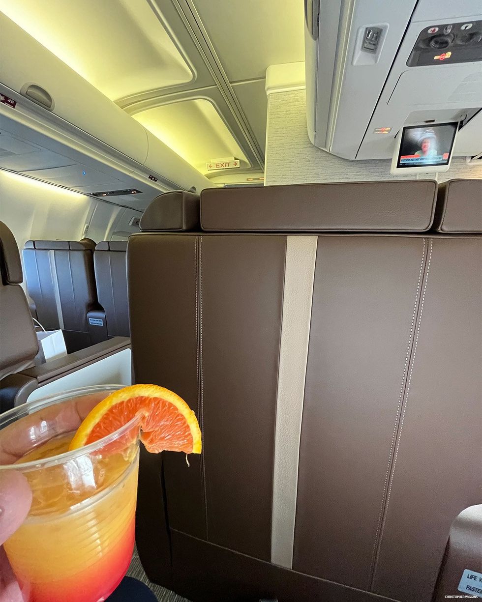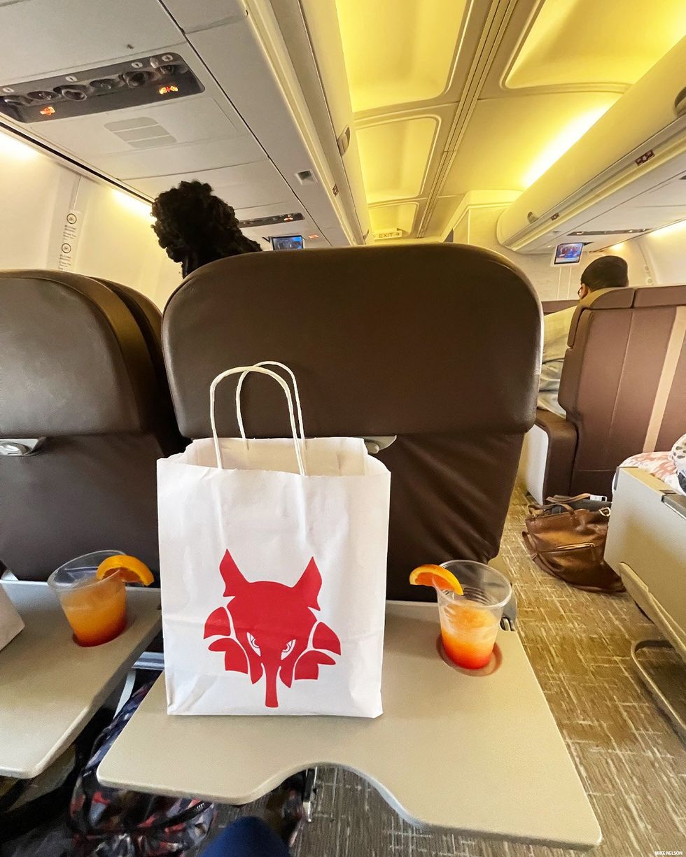 As departure time approached, staff, Mike, and I boarded Air Force Two. Once aboard, passengers were treated to a sunrise drink which consisted of orange juice, a splash of grenadine, and an orange slice. Already at each seat was a meal prepared for immediate enjoyment.