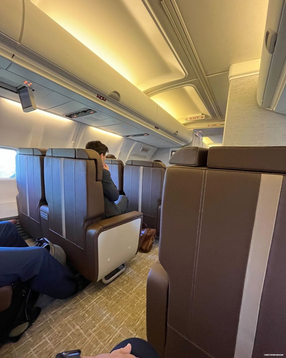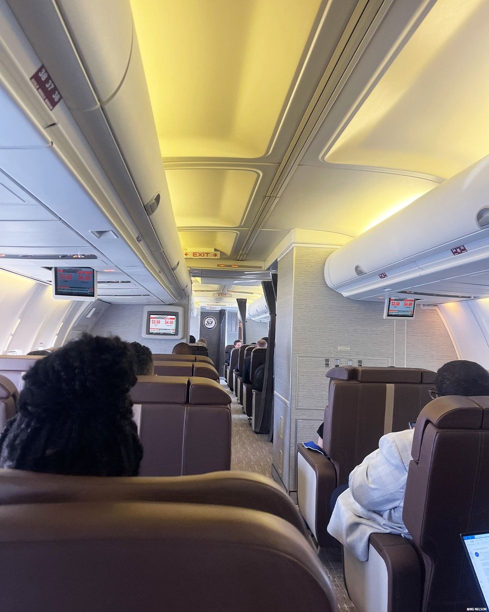 About 15 minutes into the flight, Mike and I were invited to the front of the aircraft for a few minutes of pleasantries with Harris. As Harris and I chatted, she introduced me to Reed, who was seated nearby.