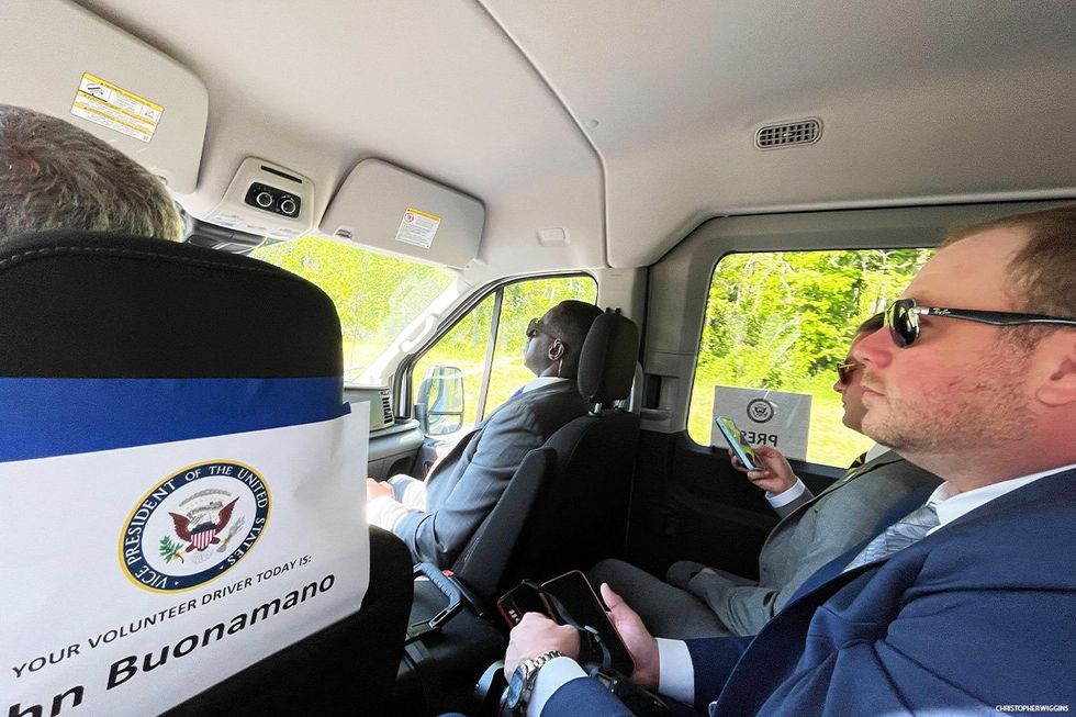 We joined Brian Karem, the former Senior White House correspondent for Playboy who now writes for Salon and was filling in for pool duty, Mario Tama, a photographer for Getty Images, and a press assistant with the VP’s office, Tate Mitchell, who handles logistics. A Secret Service agent was assigned to the group and communicated movements as necessary. He rounded out the van’s occupants.
