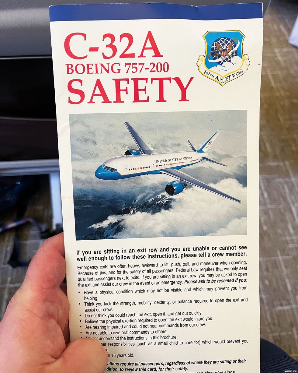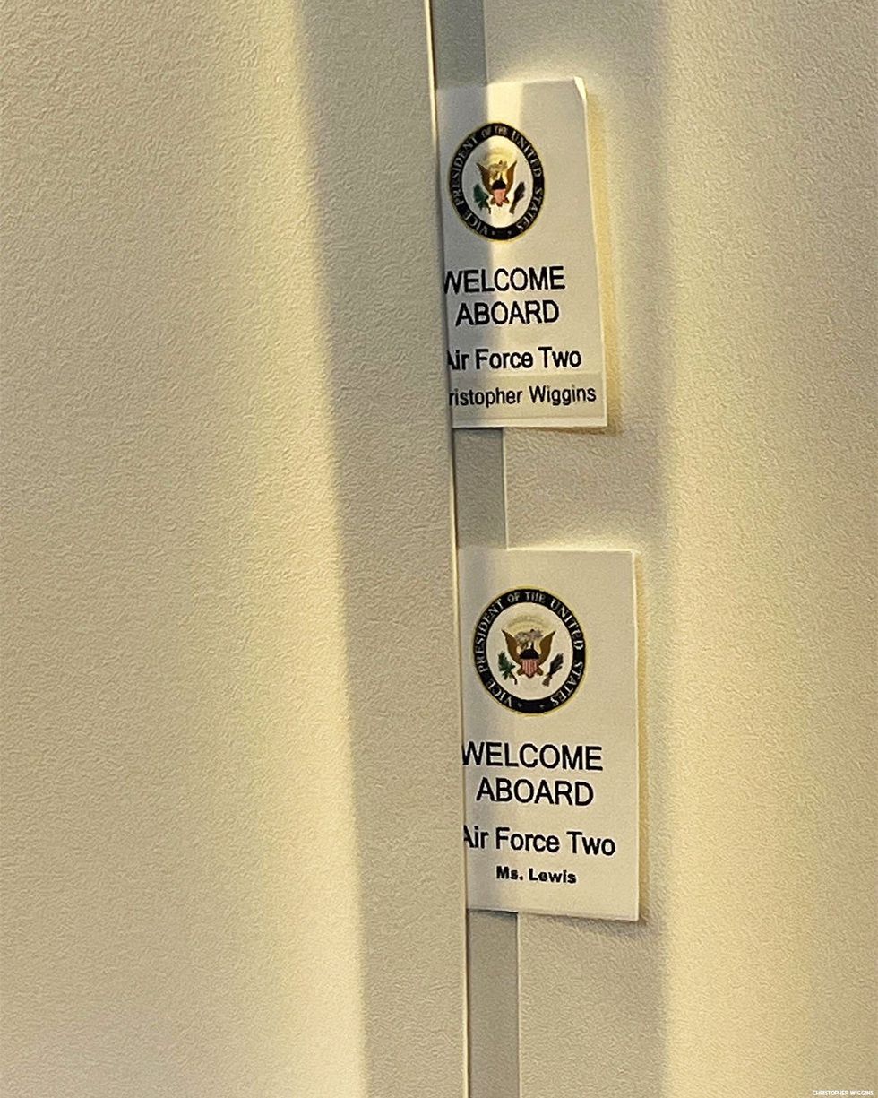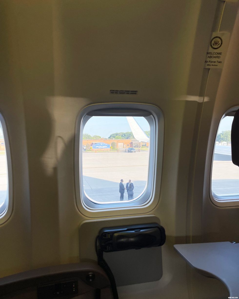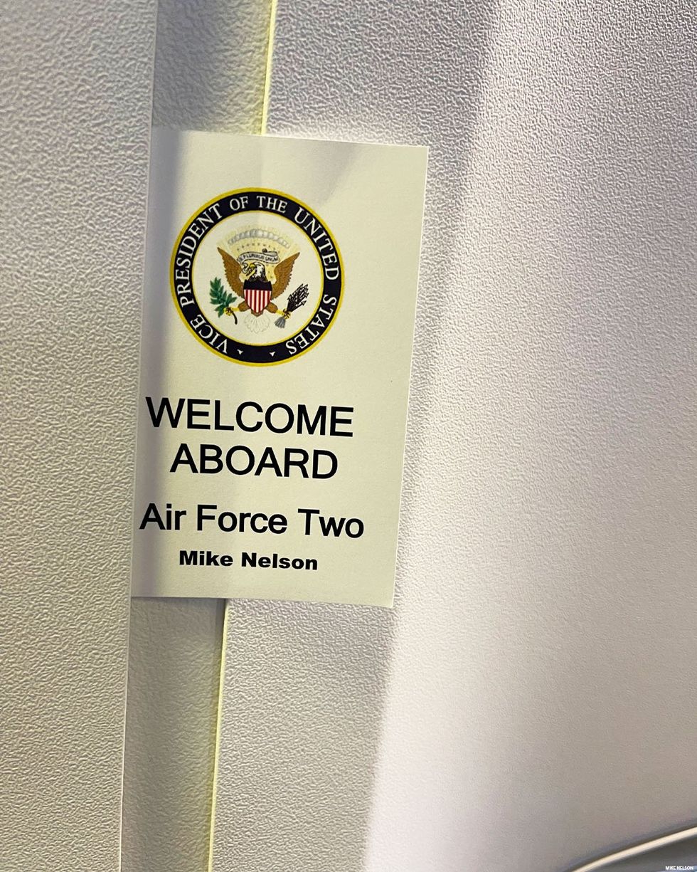 At each seat, a card read “Welcome aboard Air Force Two” with the passenger’s name printed on it. (Just about everybody keeps their card as a memento.)