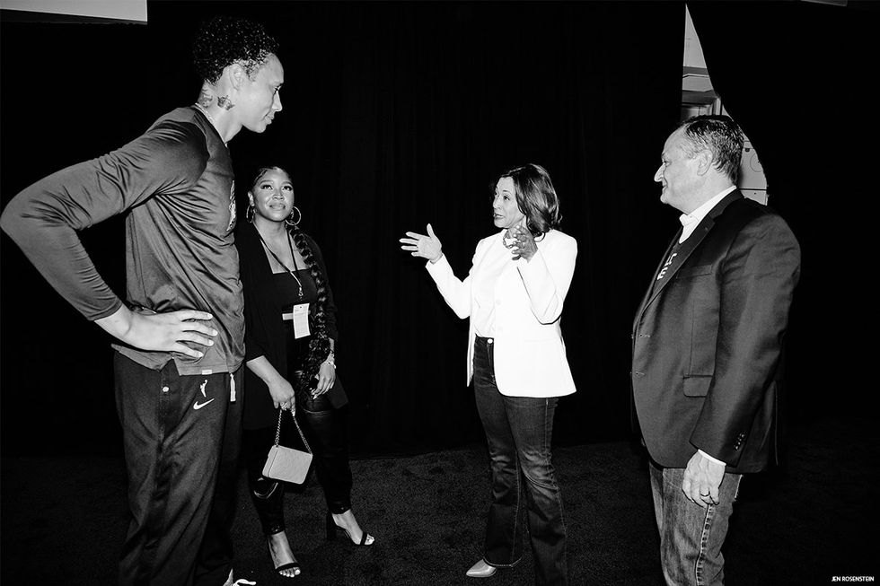 Shortly after that, Jen and I were invited to exclusively witness Harris and Emhoff meet with Griner and her wife, Cherelle, during a private, quiet moment. Harris’s engagement had been integral to freeing the WNBA star.