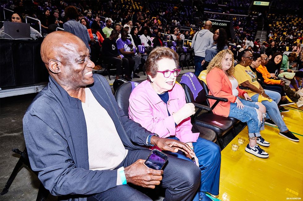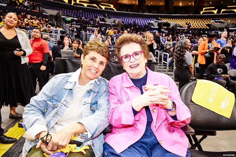Next, we were all brought onto the basketball court, passing by tennis star Billie Jean King, her wife, and basketball superstar Magic Johnson, who were all in attendance. Saturday Night Live comedian Leslie Jones was among the thousands of spectators.